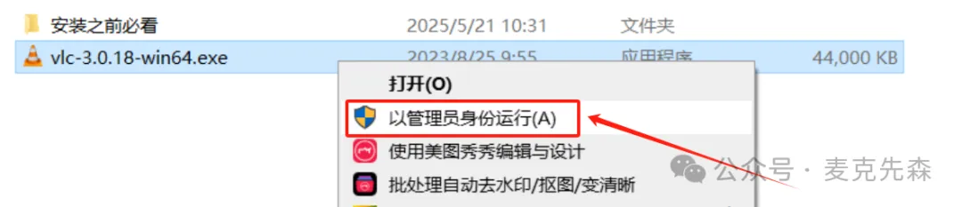2.打开解压后的文件夹,找到【vlc-3.0.18-win64.exe】应用程序,右键选择【以管理员身份运行】。