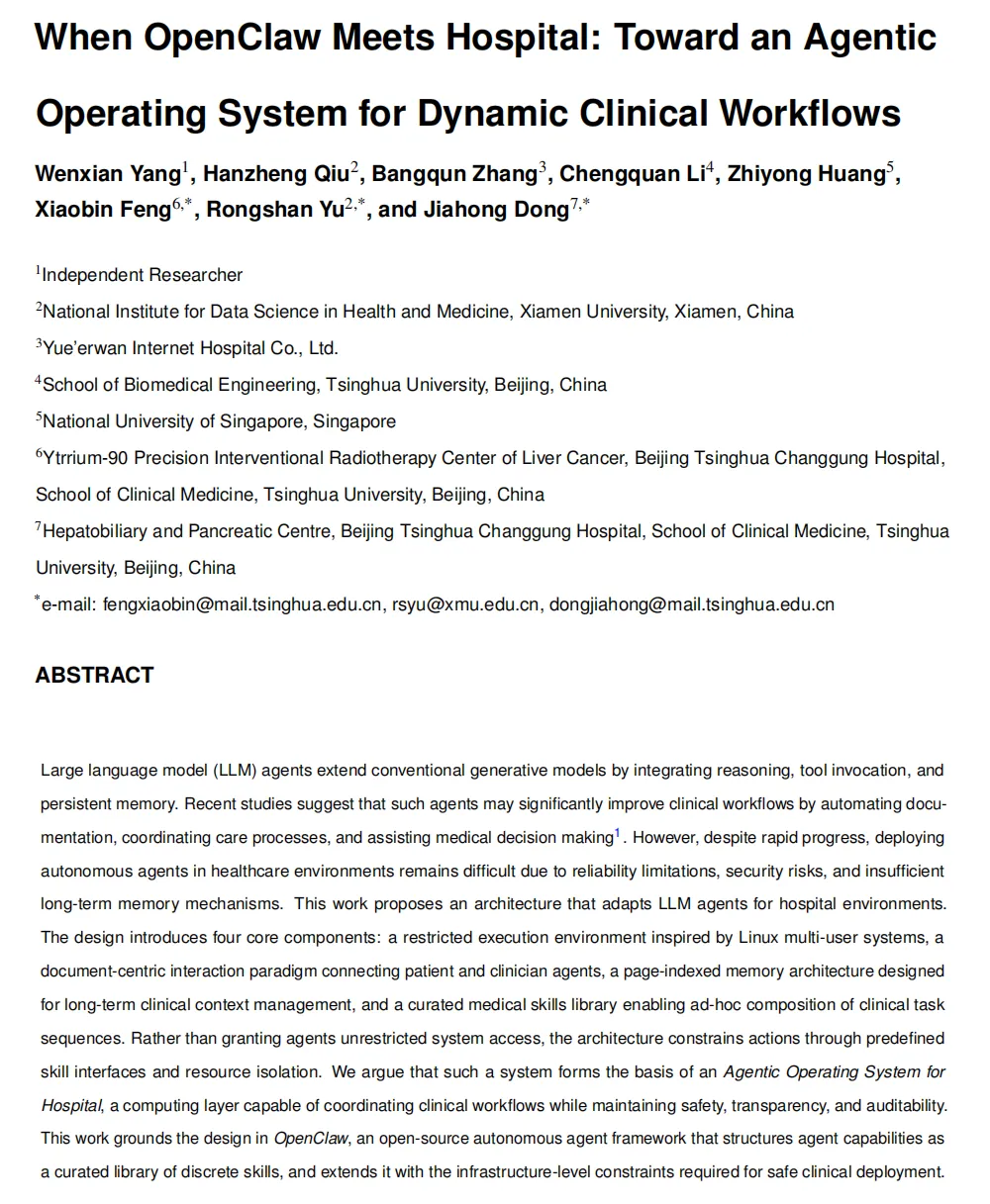 本文提出了一个专为医院环境设计的大语言模型(LLM)代理架构,通过引入受限执行环境、面向文档的交互范式、页面索引记忆架构和医学技能库,解决了在医疗环境中部署自主代理的可靠性、安全性和记忆机制等核心问题。该"医院智能代理操作系统"将代理权限限制在预定义的技能接口内,通过操作系统级别的隔离实现安全保障,并能灵活组合临床任务序列以适应医疗实践中的长尾变异性需求。