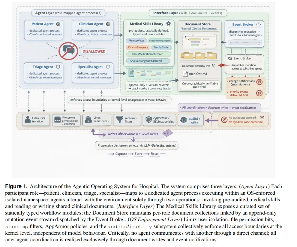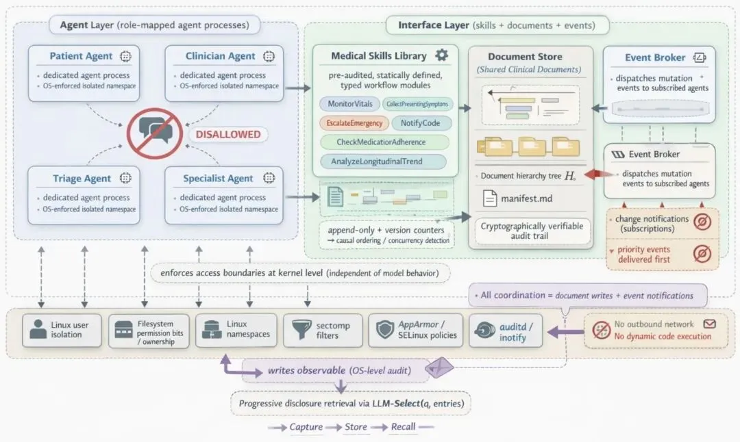 每个参与者角色——患者、医生或临床工作人员——都映射到在自己隔离命名空间内执行的专用代理进程。该命名空间仅暴露由经过授权的工具调用组成的固定接口;直接文件系统访问、出站网络连接和动态代码加载在运行时级别被禁止,而不是通过模型级别的指令来强制执行。这种设计将信任强制从模型的指令遵循行为转移到执行环境本身,提供了更强和更可审计的安全保证。