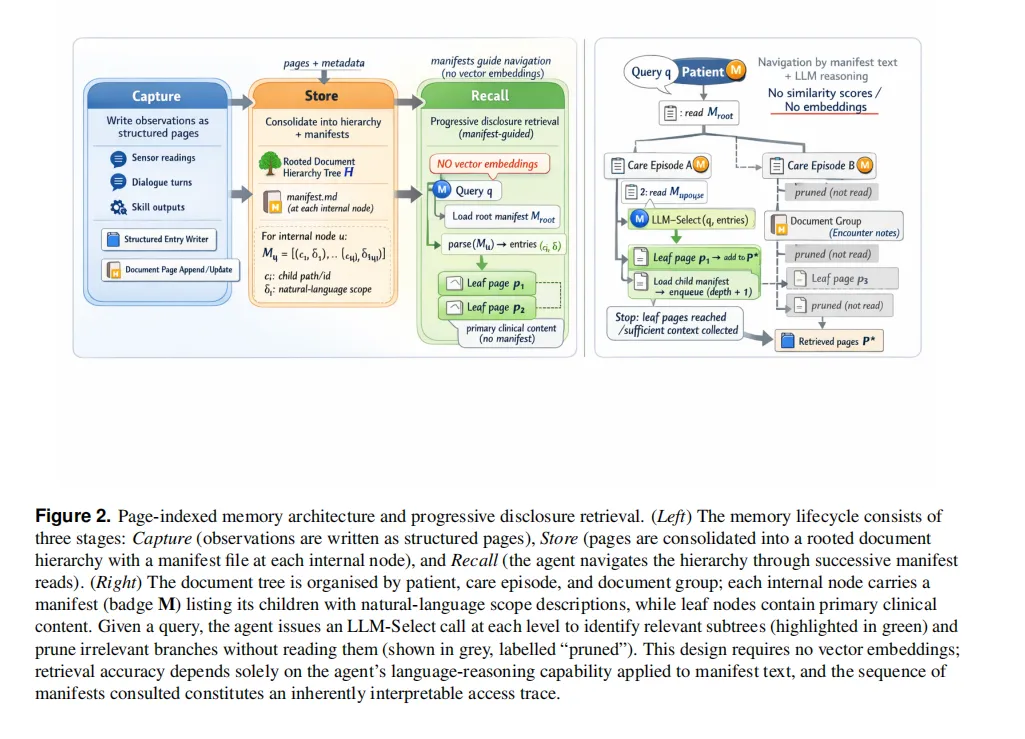 渐进式披露检索策略而不是计算相似度分数。代理首先在根清单Mroot开始,在每个级别将清单条目与当前查询一起呈现给LLM;LLM选择要展开的子节点的子集。未选择的分支被剪除而不被读取,避免不必要的上下文消耗。遍历继续,直到到达叶页面或代理确定已收集足够的上下文为止。这种方法替换了基于嵌入方法的相似度函数与代理的完整语言理解能力,允许它同时推理临床范围、时间相关性和文档类型,而不是将所有三个维度简化为标量距离。