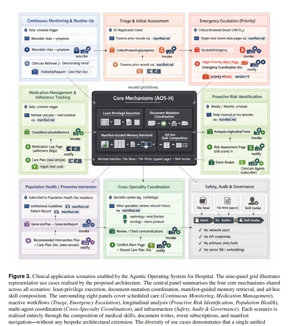 因此,为医疗环境调整代理不主要是一个模型能力问题,而是一个基础设施设计问题。本研究提出将代理嵌入到一个由临床环境的安全性、记忆和协调需求特别塑造的受控计算层中。这一层被称为"医院智能代理操作系统",包含四个核心组件:受限执行环境、页面索引记忆架构、面向文档的多代理协调模型,以及支持临床任务即席组合的医学技能库。