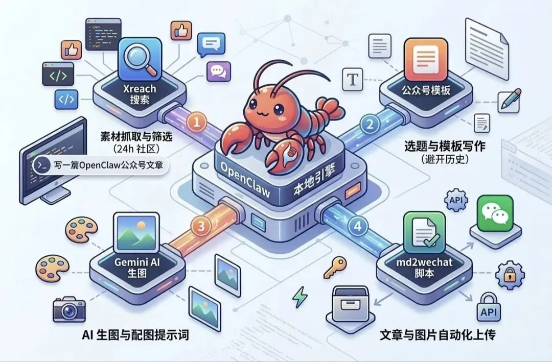 OpenClaw先是自动跑了xreach搜索脚本,爬了24小时内社区里所有和OpenClaw相关的教程、经验、趣事、自动化玩法,一共50条内容,过滤出了有用的素材。 然后它自动读了之前用过的主题记录,避开了已经发过的主题,选了「自动发公众号全流程」这个选题。 接着它按照预设的公众号写作模板,填素材写了2000字左右的文章,然后自动生成了封面图和内文配图的提示词,调用Gemini生图,再把图片插到文章里。 最后它直接调用md2wechat脚本,把整篇文章带封面图一起传到了我绑定的公众号草稿箱里。 整个过程我什么都没干,就发了那一句话。 对了,这个发公众号的Skill直接在ClawHub搜「md2WeChat-python」就能安装,装完就能用。