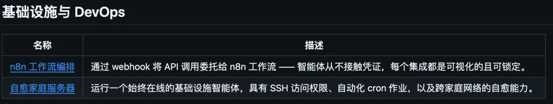基于 n8n 的可视化工作流编排,安全隔离 API 凭证 自愈型家庭服务器:能 SSH、能定时任务,还能跨设备自动修复故障 4. 生产力模块