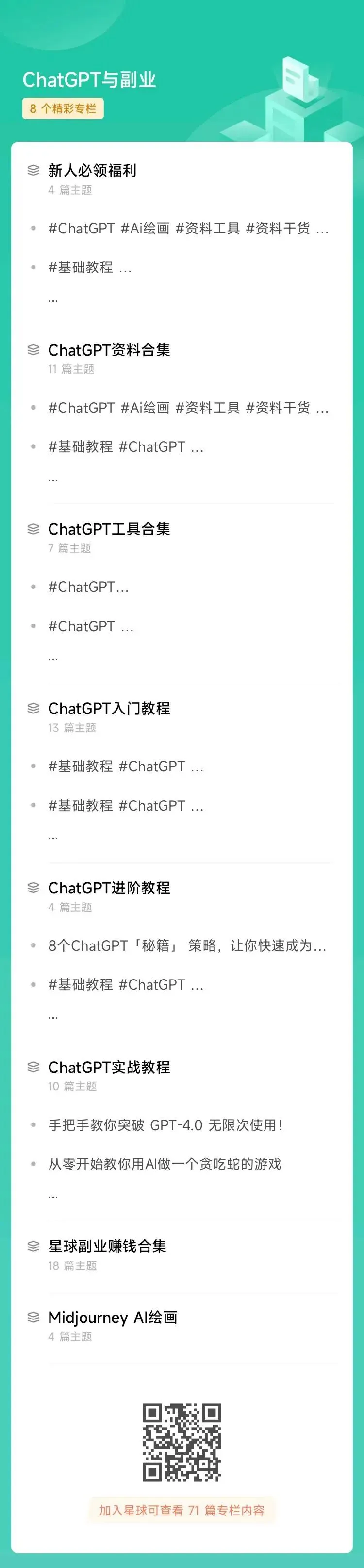 为了跟上AI时代我干了一件事儿,我创建了一个知识星球社群:ChartGPT与副业。想带着大家一起探索ChatGPT和新的AI时代。