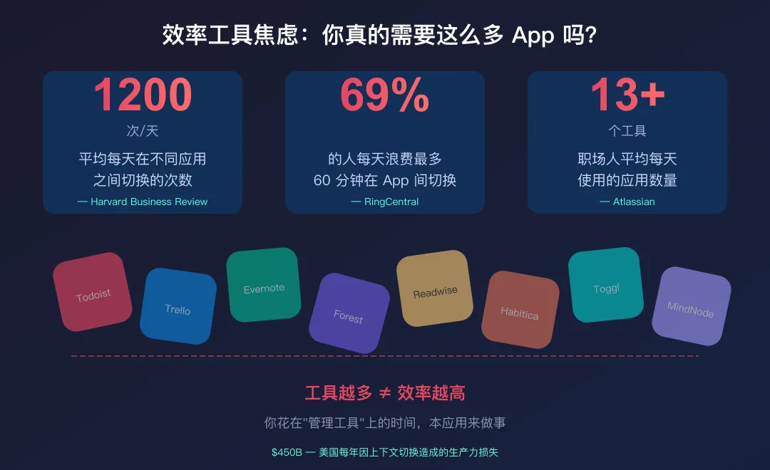• 早上打开 Todoist 看今天的任务 • 切到 Notion 查会议笔记 • 去 Trello 更新项目进度 • 回到日历确认下午的安排 • 想起来读书笔记在 Readwise 里,再切过去 • 顺手打开 Forest 计时,但发现刚才忘了记笔记,又回到 Notion