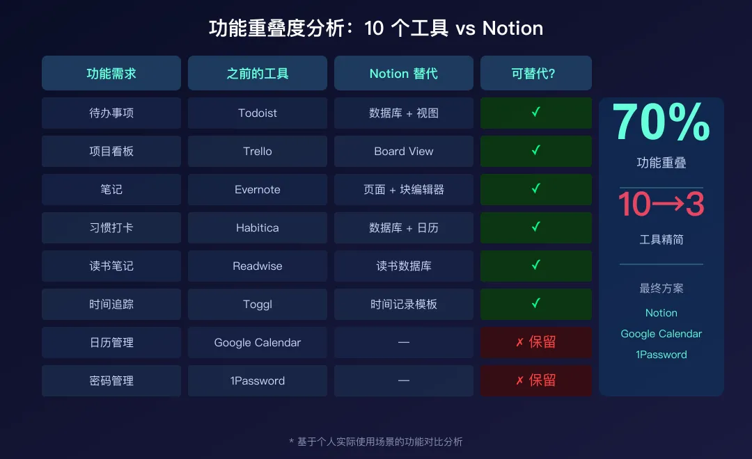唯一让我犹豫的是日历(Google Calendar)和密码管理(1Password)——这两个确实有不可替代性,不属于 Notion 能覆盖的范围。