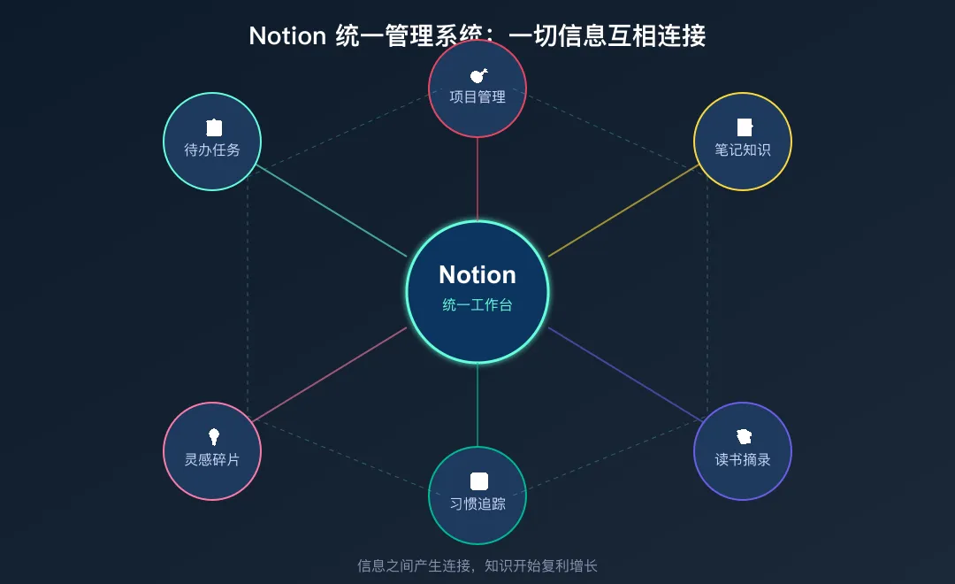 所有的笔记、项目、待办、读书摘录、灵感碎片,全部在 Notion 里。它们不再是孤岛,而是可以互相关联的网络。
