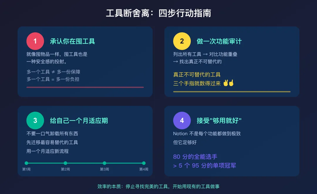 第二,做一次功能审计。 把你现在用的所有工具列出来,对比功能重叠度。你会发现真正不可替代的工具,三个手指就数得过来。