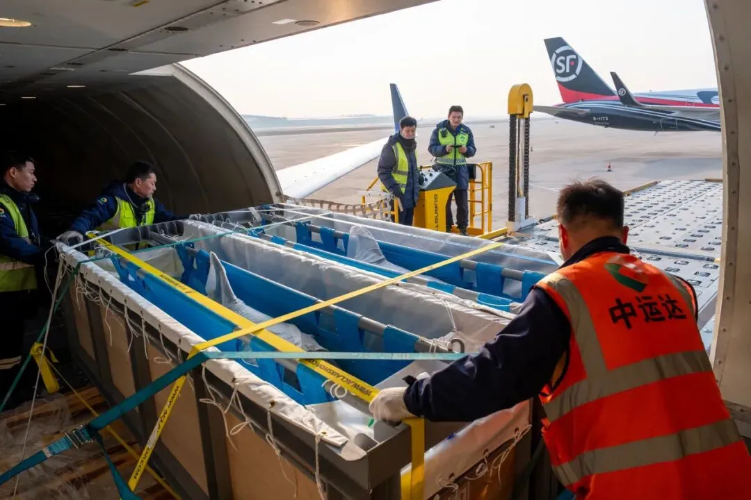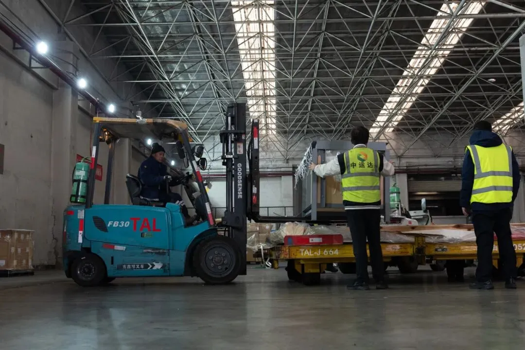“准备卸机,注意平稳!”随着现场指挥的指令,保障人员协同配合,将载有海豚的专用水箱托盘平稳推送至舱门,随后缓缓将其卸载至拖车上,全程衔接流畅、有条不紊。尤其令人印象深刻的是,从舱门开启到完成卸机仅用时11分钟,最大限度减少了海豚的应激风险。接下来,载有海豚的专用水箱从机坪转运至货站。与此同时,机场海关现场查验关员与货主代表在货站内仔细核对海豚运输相关单证信息,确保入境手续合规完备,高效推进通关工作,最大限度缩短动物在机场的停留时间。