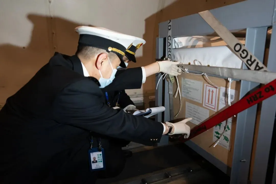 天津滨海机场海关现场查验关员登上货机,对入境瓶鼻海豚的运输单位与箱体标识进行现场核验。