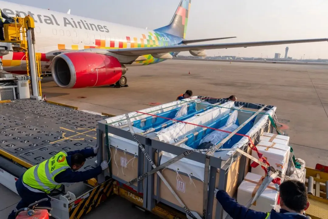 工作人员将海豚转运至天津滨海机场货站。