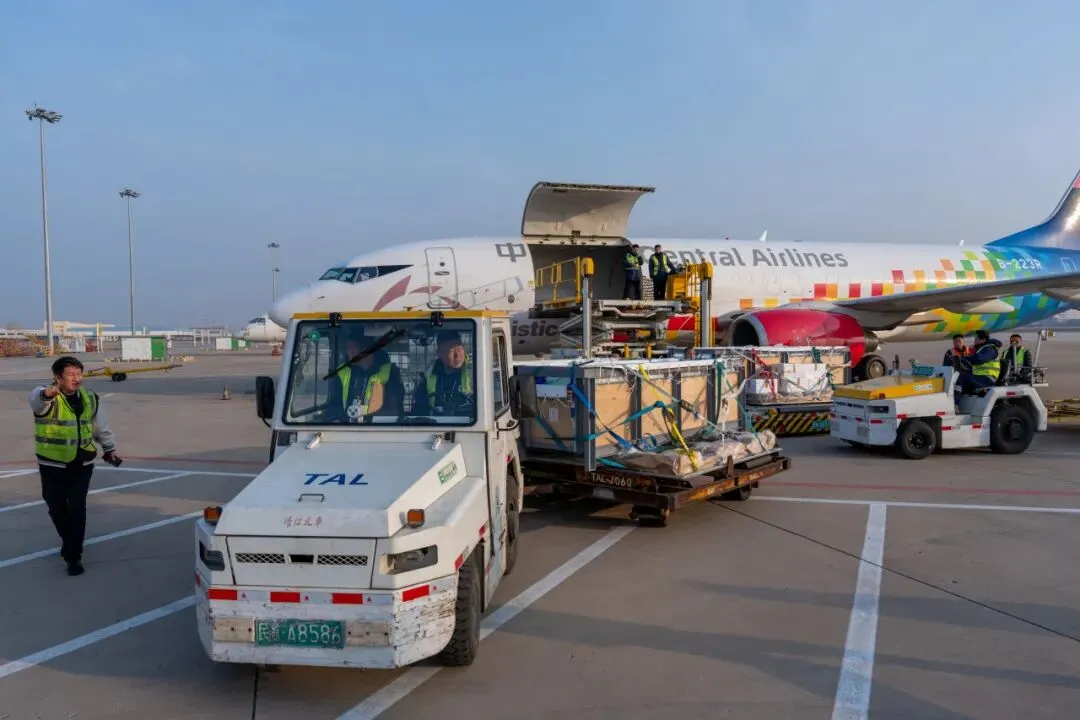 天津滨海机场机坪上,工作人员将载有海豚的专用水箱托盘推送至中州航空货机舱门。