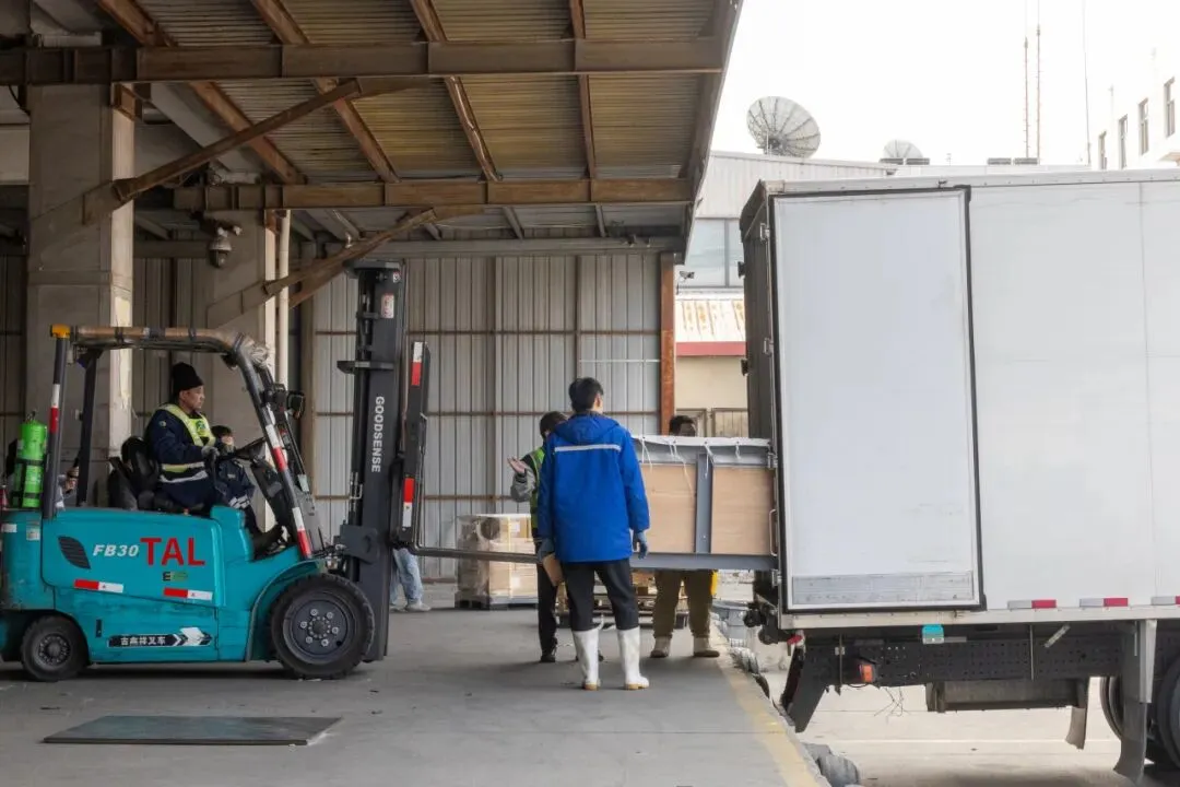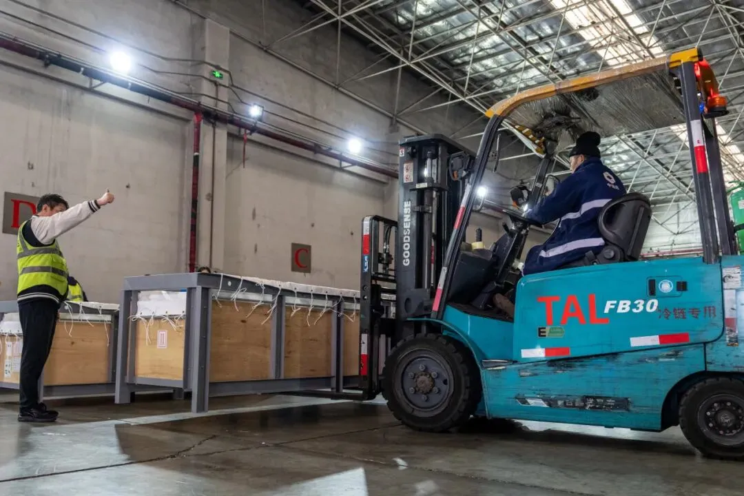 在天津滨海机场货站,工作人员操作叉车将载有海豚的专用运输水箱平稳转运至专用运输车辆。
