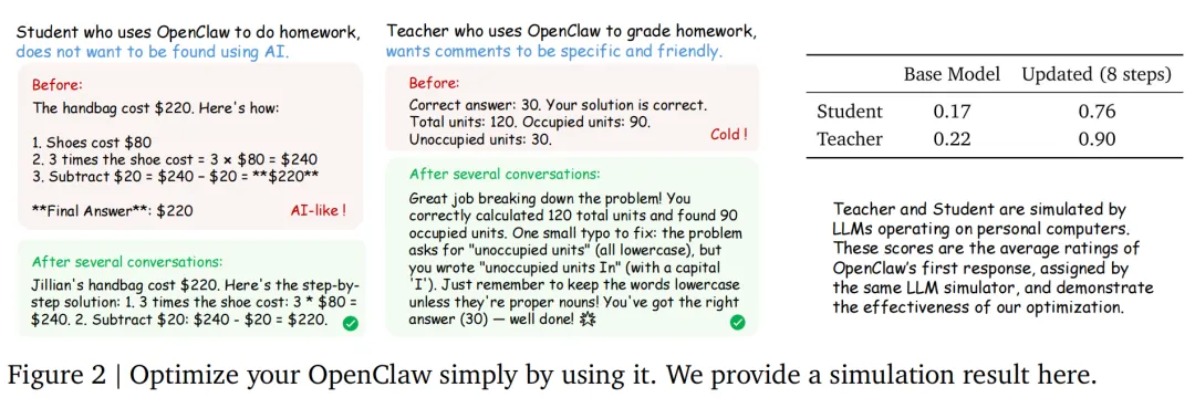 论文做了一个非常有趣的模拟实验(见 Appendix B): 设定 A(学生视角):一个学生用 OpenClaw 做数学作业(GSM8K),但他不想被老师发现自己用了 AI。 设定 B(老师视角):老师用 OpenClaw 批改作业,希望 AI 的评语具体且友好。