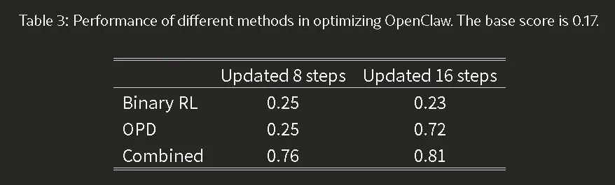 • 纯 Binary RL 得分:0.23 (提升微弱) • 纯 OPD 得分:0.72 (提升明显,但起效较慢,因为提取 Hint 的轮次较少) • Combined 混合方法得分:0.81 (收敛极快,效果最好)