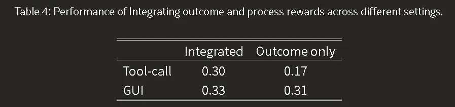 在 Tool-call 和 GUI 场景下,加入过程奖励(Integrated)对比仅用最终结果奖励(Outcome only):