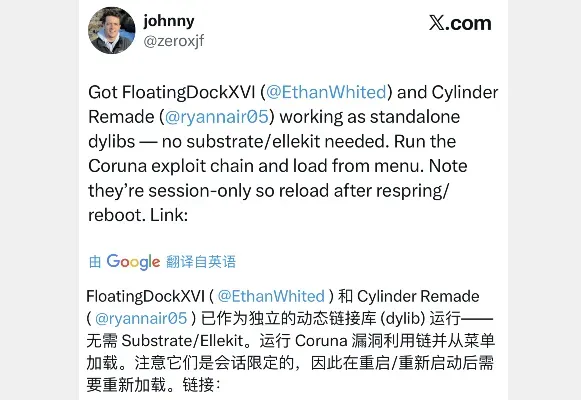在3月17日上午时段,johnny 作者在 X 推特发文称,提供一些支持 Coruna 越狱的插件,此插件移除 Substrate 和 Ellekit 依赖,直接注入即可加载插件,不需要重启手机即可生效。