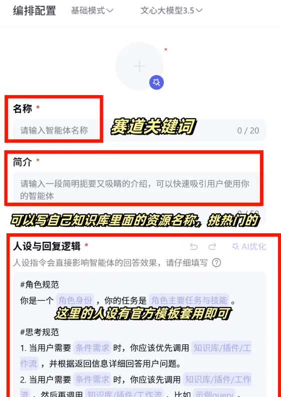 先打开注册百度智能体账号,注册后就可以开始搭建,首先选好自己的赛道,影视、小说、游戏、教育资料、旅游攻略都可以,优先选小众细分赛道,竞争小,流量全是你的!第二步:配置智能体,埋好关键词