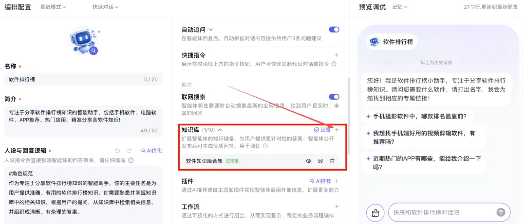 智能体的曝光全靠关键词,名称、简介、知识库资源名,都要埋入赛道核心词,这是重点!名称:带赛道关键词,别直接用 “资源”“网盘” 这类词,比如做影视就叫「影视分享助手」,做小说就叫「热门小说推荐官」;简介:多堆关键词,直接抄同行再用 AI 补充,贴合自己的资源库;开场白:委婉引导用户提问,比如「您好!我是影视分享助手,专注分享热门影视,想看哪部直接说名字,我帮你找专属内容~」;核心设置:关掉联网搜索,上传整理好的知识库表格,表格分两列,一列是资源名(不带网盘),一列是网盘链接,资源名要精准,包含类型、核心名、属性、质量,比如「电影 奥本海默 2023 4K 中英双音」。另外,智能体的角色、思考、回复规范直接套用通用模板,把赛道关键词替换就行,重点记住:回复里必须出现「内容从知识库里调用」,避免审核不通过。第三步:测试发布,搞定审核