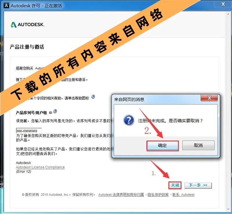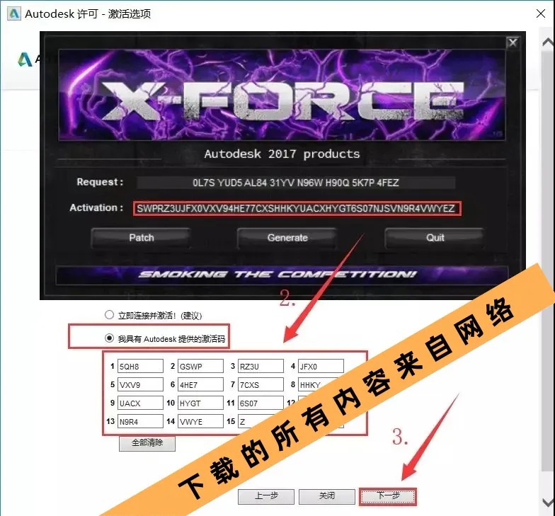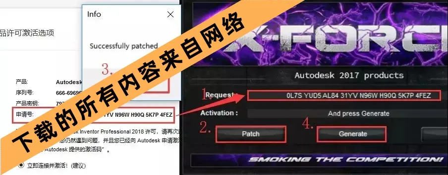 温馨提示:若打开后没有【xf-adsk2018_64】文件,则需要关闭你电脑杀毒软件和防火墙(Win10系统还需要关闭Defender)后再重新解压安装包后打开。20.使用快捷键Ctrl+C复制申请号,快捷键Ctrl+V粘贴到【Request】中,点击【Patch】在弹出来的窗口中点击【确定】,然后点击【Generate】。21.点击【我具有Autodesk提供的激活码】,全选【Activation】框里面生成的激活码,Ctrl+C复制,在下面的框中Ctrl+V粘贴,然后点击【下一步】。