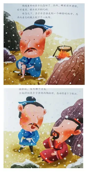 跟随重耳的臣子们急坏了。然而,那里前不着村,后不着店,根本找不到吃的。情急之下,臣子介子推走到一个僻静的地方,忍痛从自己的腿上割下了一块肉。介子推煮了一碗肉汤,让重耳喝下。 渐渐地,重耳醒了过来。当他得知是介子推割肉相救时,感动得落下了眼泪。