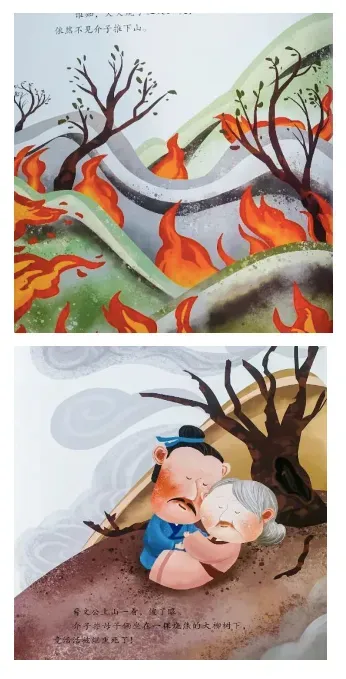 谁知大火烧了三天三夜,依然不见介子推下山。晋文公上山一看,傻了眼。介子推母子俩坐在一棵燃烧的大柳树下,竟活活被烟熏死了!