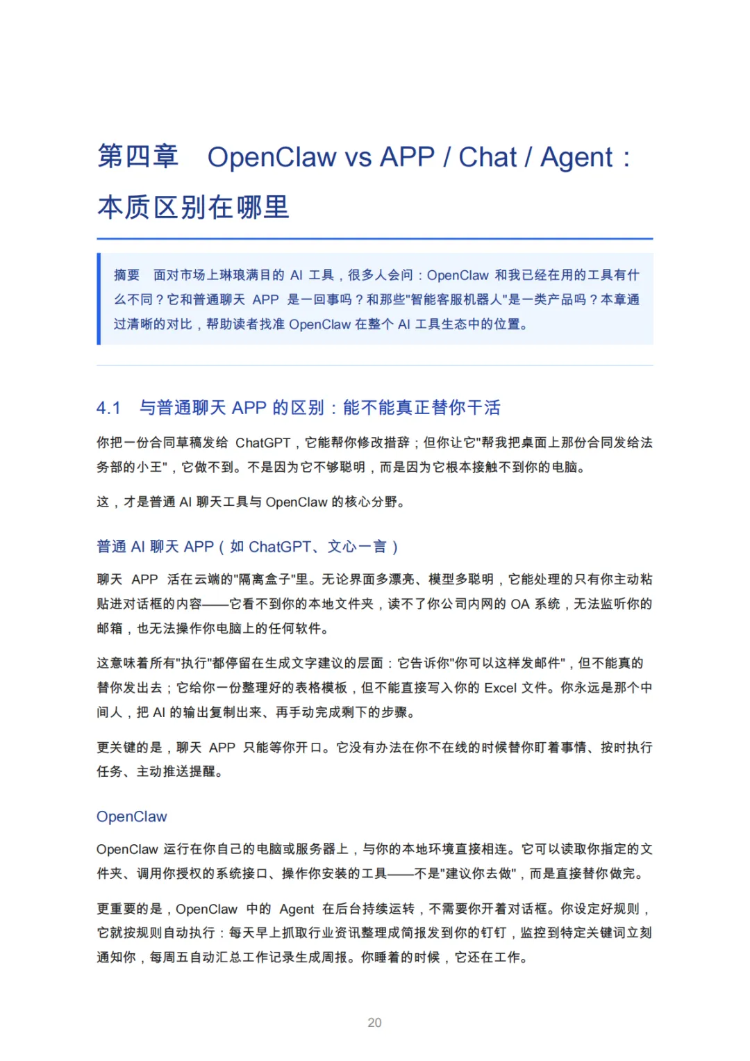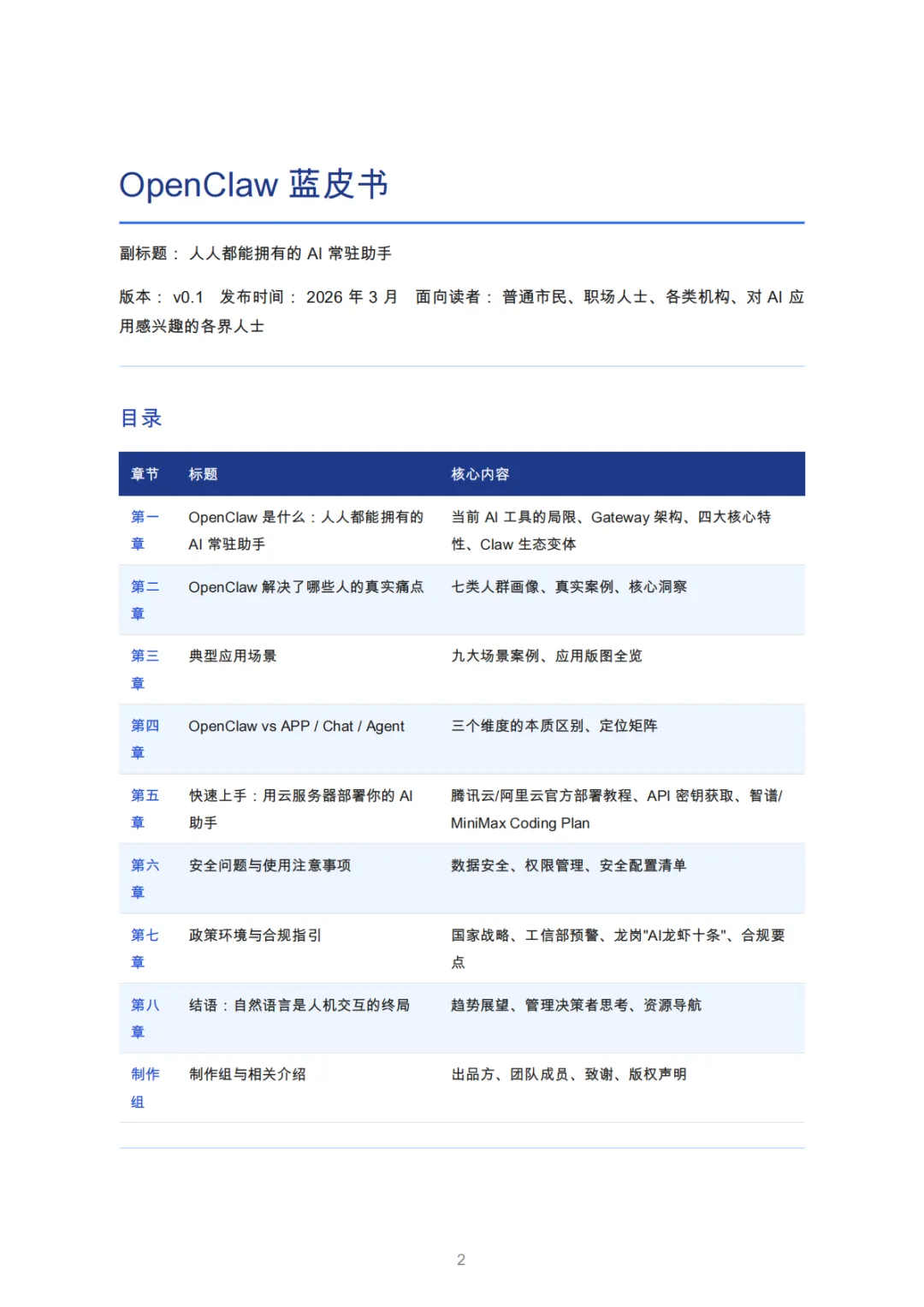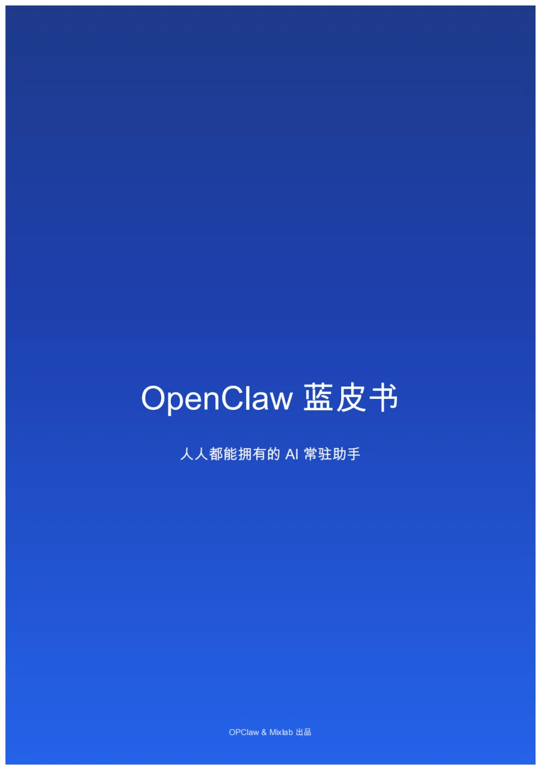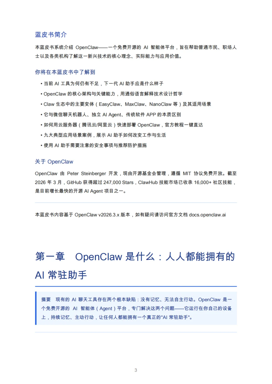 本蓝皮书系统介绍OpenClaw——一个免费开源的Al智能体平台,旨在帮助普通市民、职场人士以及各类机构了解这一新兴技术的核心理念、实际能力与应用价值。