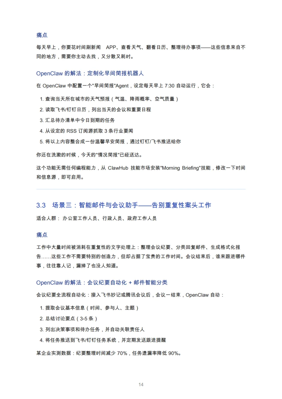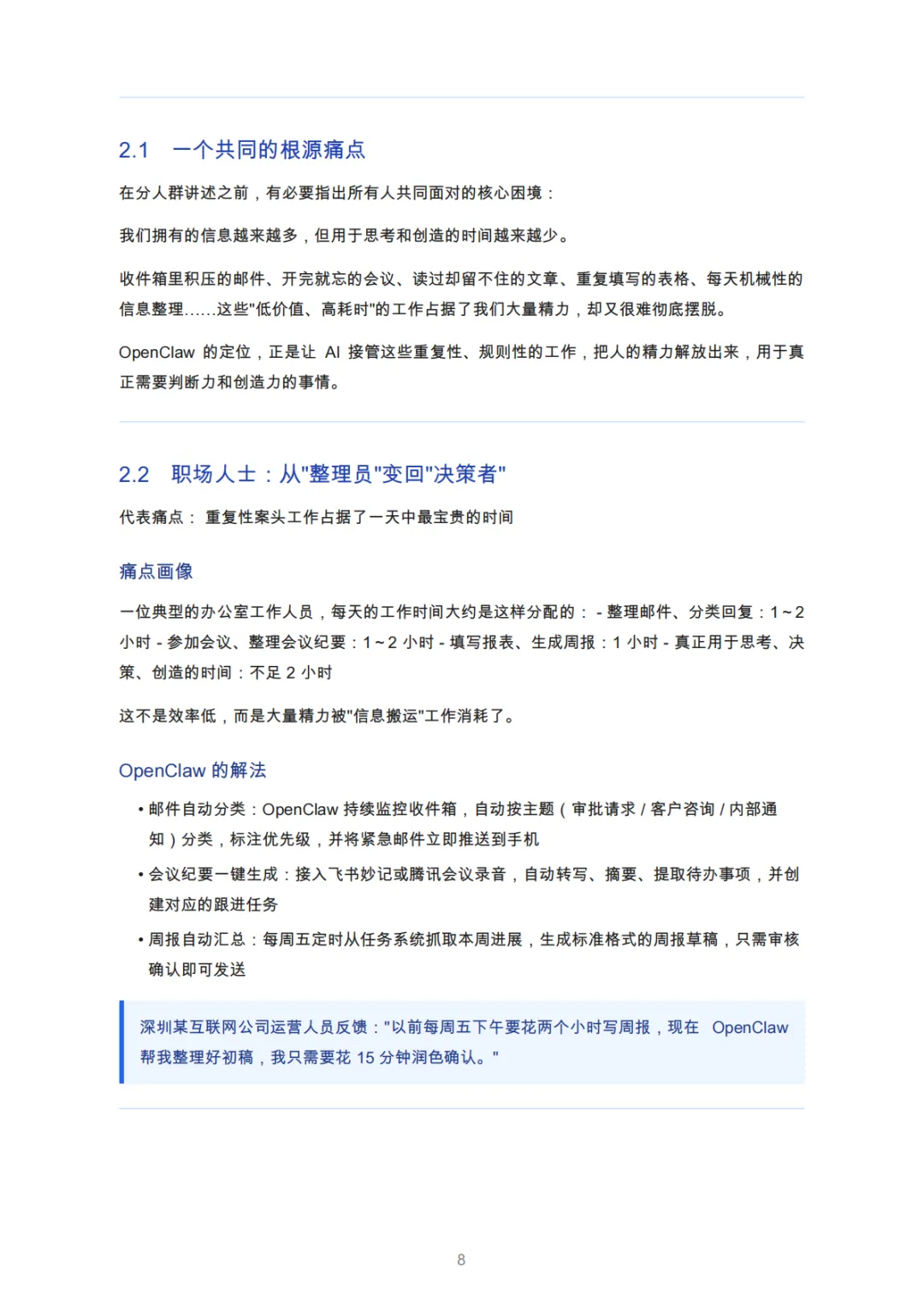 职场人士 | 重复性工作耗时(邮件/会议/报表) | 邮件分类、纪要自动生成、周报自动化 | 深圳某公司运营人员效率提升80% |