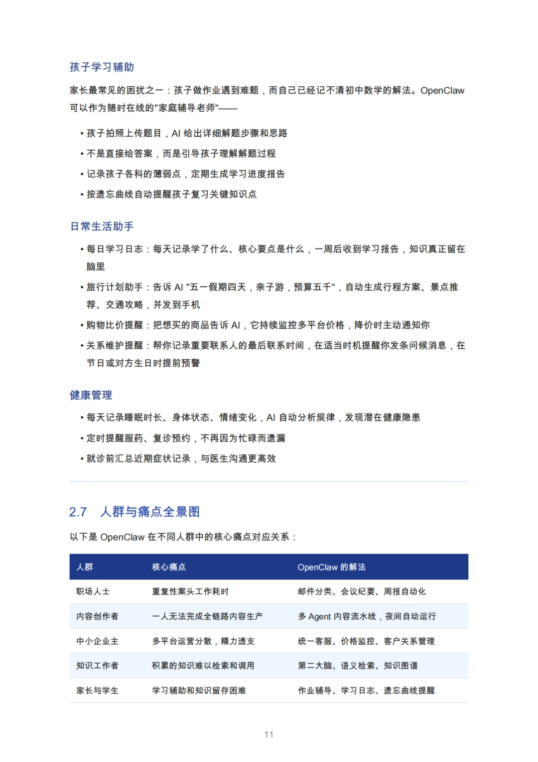OpenClaw瞄准七类人群的共性痛点,提供“系统级解决方案”而非碎片化功能: