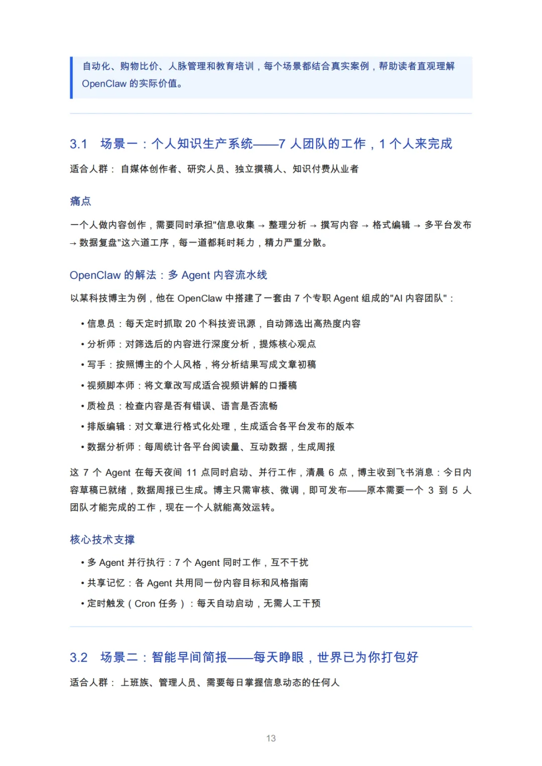 内容创作者 | 单兵作战效率瓶颈 | 多Agent内容流水线(信息收集→写作→发布) | 科技博主内容产出效率提升3倍 |
