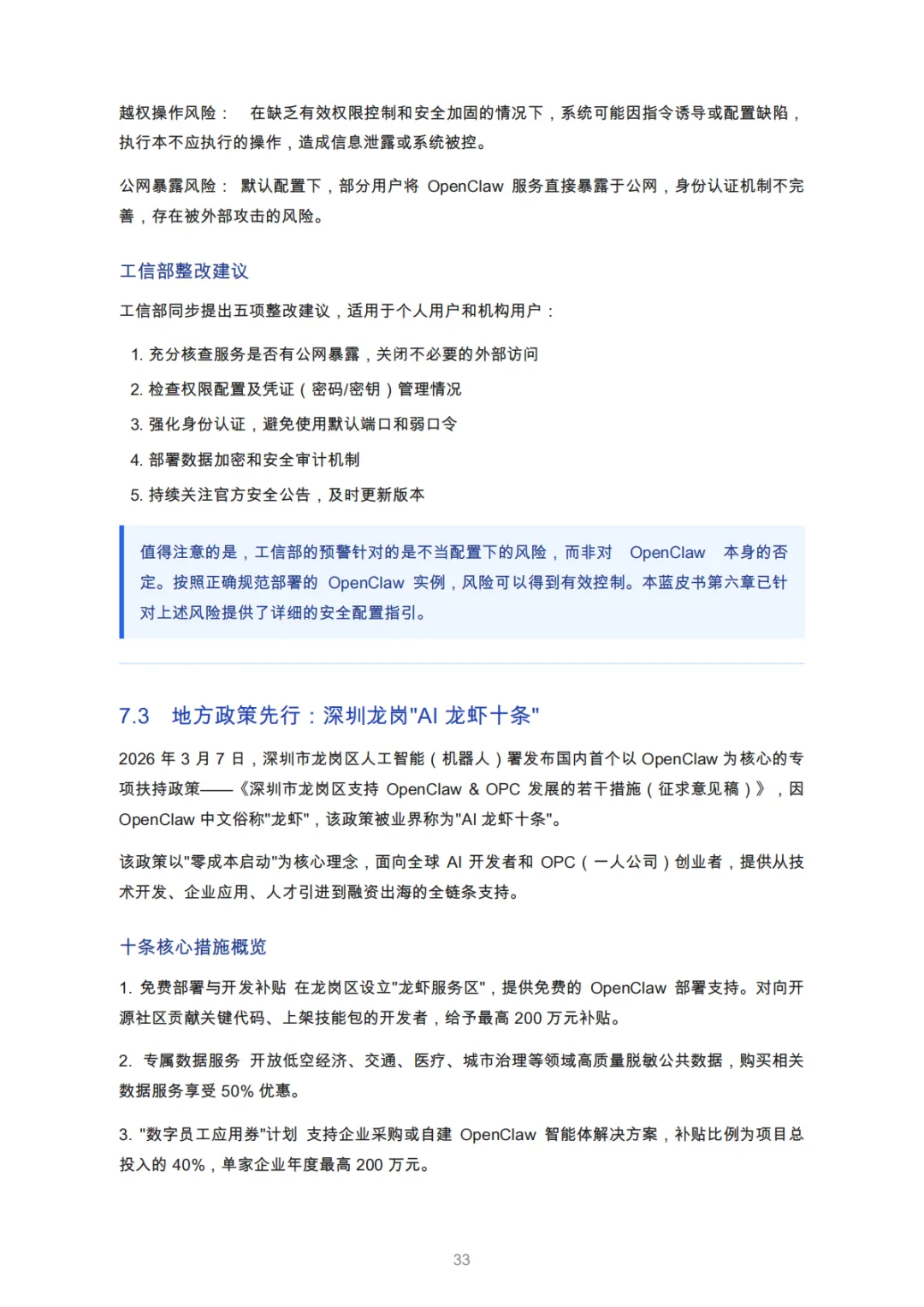 政府/机构 | 数据孤岛与合规压力 | 本地化部署、操作留痕、政策问答机器人 | 深圳龙岗区“AI龙虾十条”政策支持 |