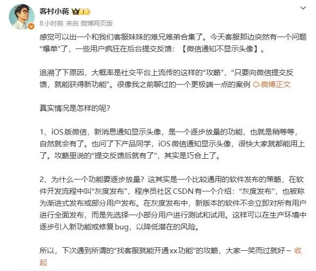 3月18日凌晨,微信员工@客村小蒋 发文透露,“iOS版微信的新消息通知显示头像,是一个逐步放量的功能,也就是稍等等,自然就会有了。也问了下产品同学,iOS微信通知显示头像,很快大家就都能用上了。”所谓“提交反馈给客服可开通新功能”的攻略纯属巧合,是软件灰度发布的正常流程。