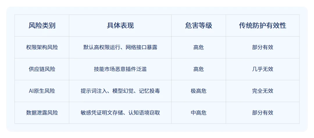 传统安全方案的底层逻辑建立在“人类可控”的假设上,而AI Agent动态执行、多步链式任务的特性,彻底颠覆了这一假设。