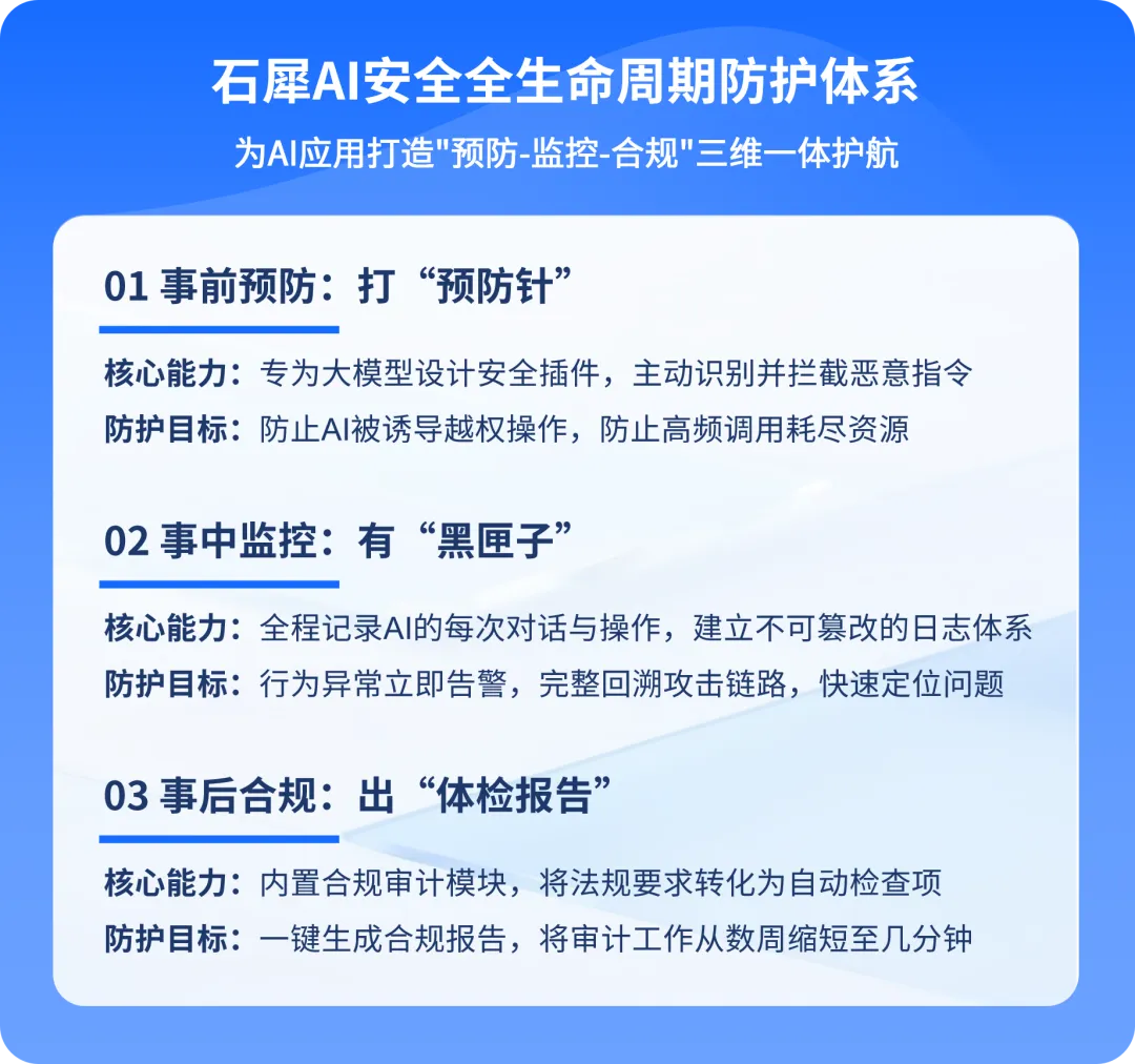 于是,石犀以AI应用识别为基础,融合内容分析、上下文语义、交互行为与合规检测等多维能力,推出「AI大模型应用安全解决方案」——以AI守护AI。