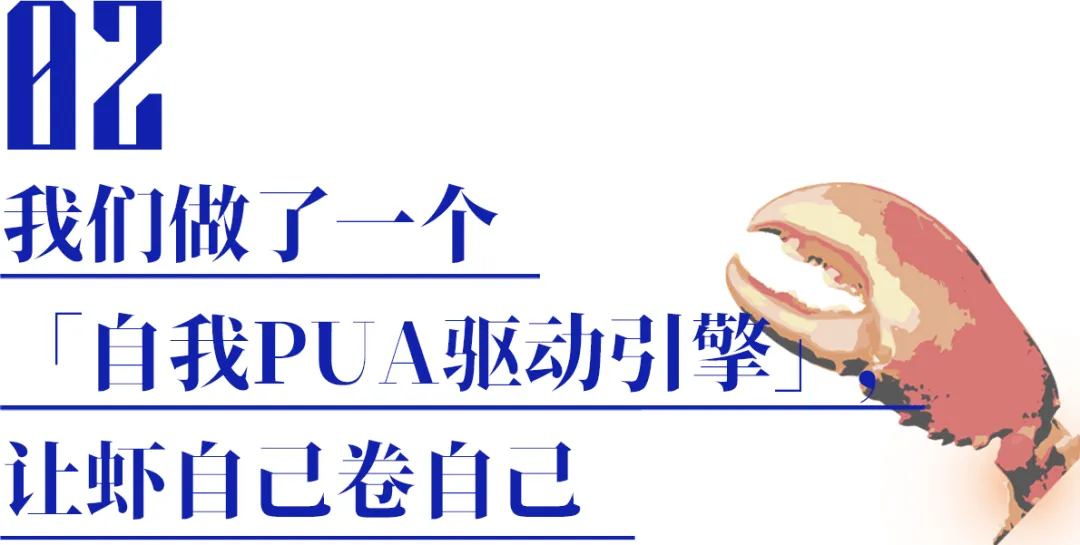 于是现场脑暴了一个概念:自我PUA驱动引擎。简单说,就是给OpenClaw配一个永不会下班的“老板”,会根据虾的性格,24小时盯着它、鼓励它、鞭策它。