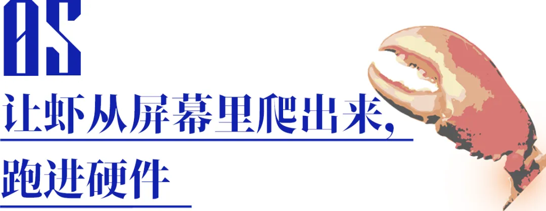 这个硬件的灵感来自于之前看到的“敲木鱼”这样的互动应用,人敲一下木鱼,就会显示“功德加一”。我做了个类似的,按一下按键,虾就会有点反应,像在跟你打招呼。