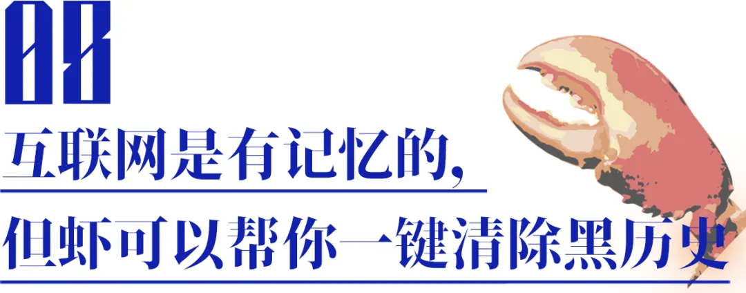 这只虾的想象空间很大,普通用户可以用来删自己黑历史,粉丝群体可以帮偶像删黑稿,企业可以用这只虾开展舆情监控。