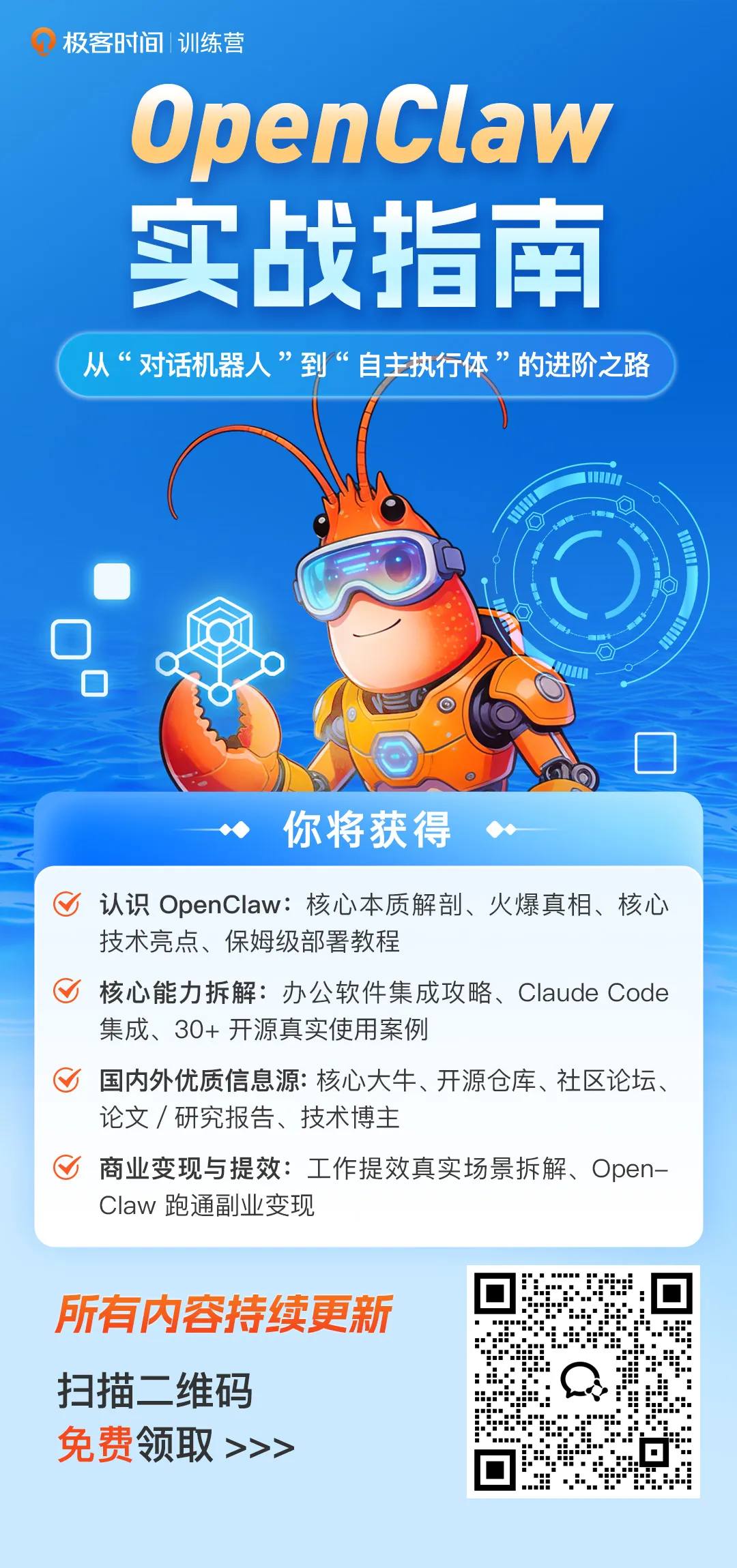 OpenClaw实战指南-打造自己专属的“AI搬砖小龙虾”大家好,我是锋哥,最近OpenClaw太火爆了,GitHub星标历史第一,超越了Linux,OpenClaw 是一个可执行任务的AI智能体,我们给指令,它不仅回答,还能主动操作系统、访问网页、处理邮件、整理文件、发起提醒甚至自动编写代码。今天锋哥向极客时间申请了一套非常好的OpenClaw实战指南,让你快速拿下OpenClaw,现在永久免费了。资料免费领取方式扫码加小助理微信,备注 OpenClaw👇👇👇添加后耐心等待,按顺序通过资料免费领取方式扫码加小助理微信,备注 OpenClaw👇👇👇添加后耐心等待,按顺序通过