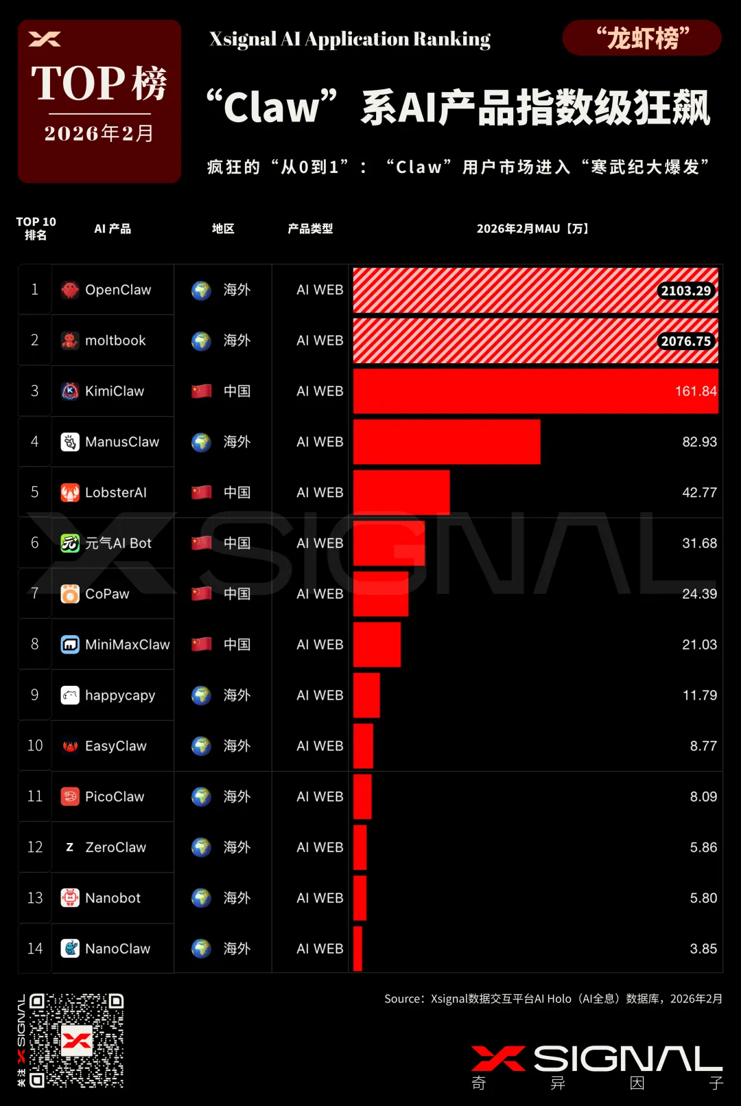 数据表现:2月集中爆发,中国区产品表现出强大的市场渗透力(如KimiClaw首月即达161.84万)。