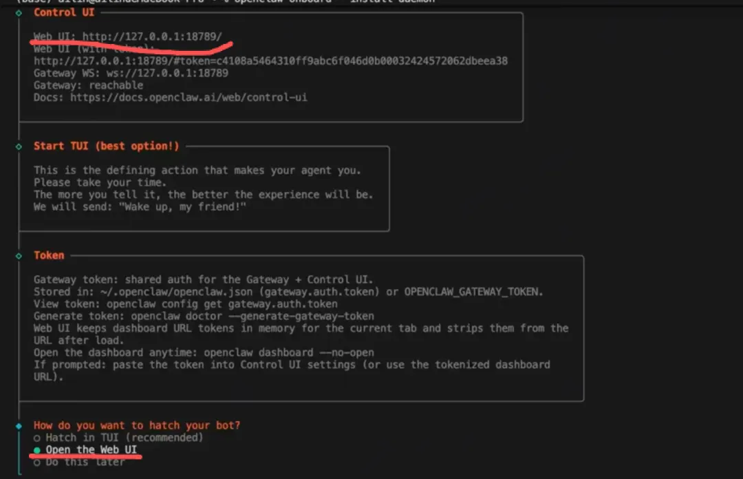 最关键的来了,最后会给你提示一个web ui 这个记录下来,是后面通过网站ui进行对话以及后台配置的。 然后通过什么方式和龙虾对话,要选择open the web ui 这时候电脑会打开页面。