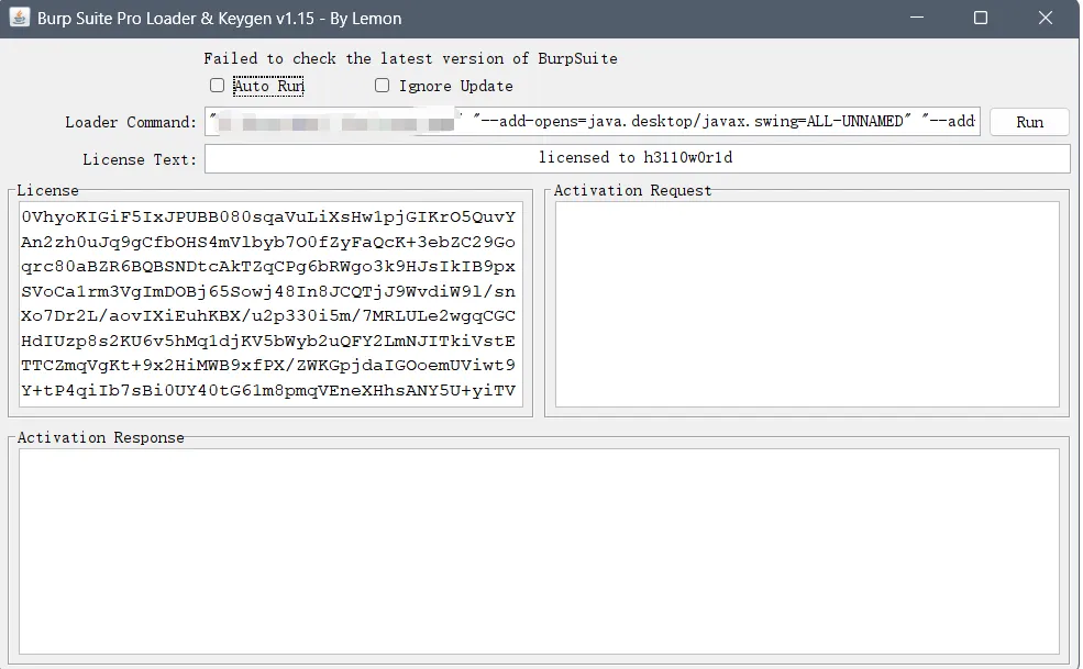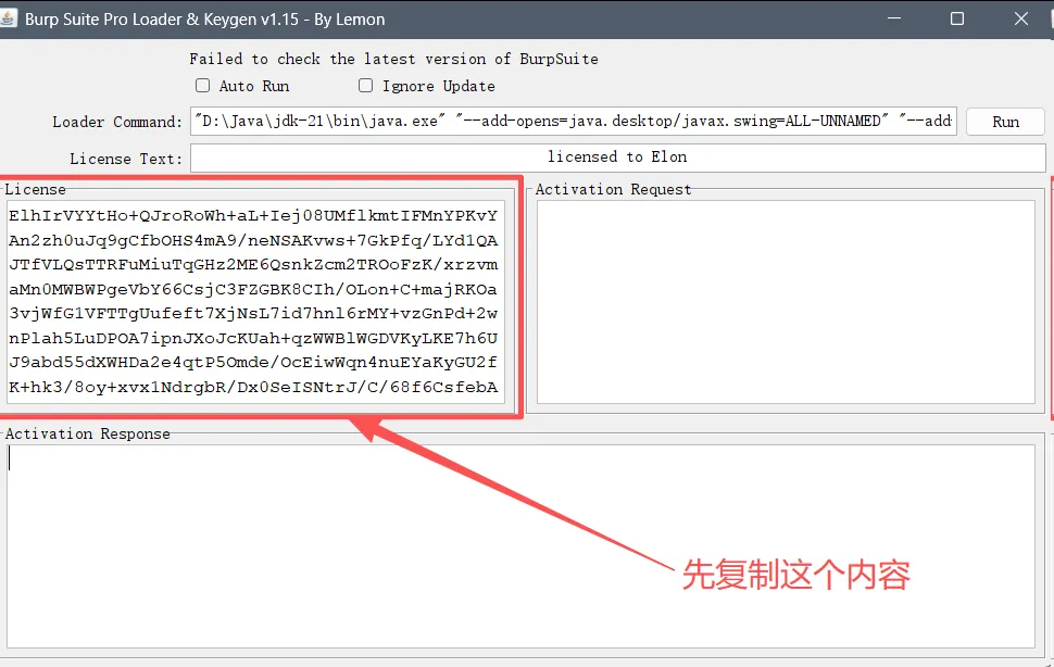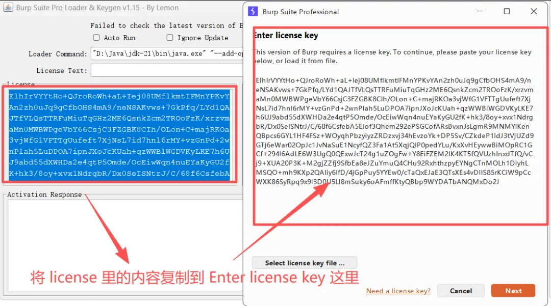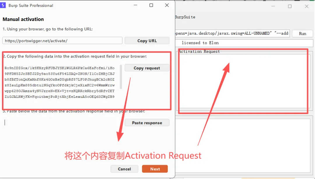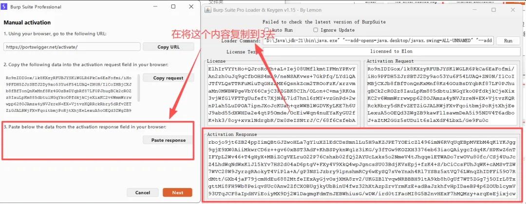 然后回到刚刚**BurpSuiteProCN.bat**的界面里面的复制到左边 “activation request” 里,下面Activation Response 会自动出现新的内容。最后把这段内容复制到选项3里点击next!