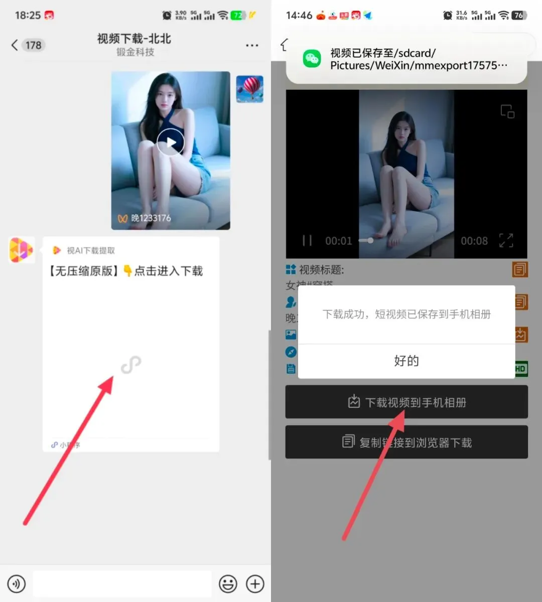 我们的智能机器人会秒速解析视频链接,并自动返回可供下载的小程序卡片。点击卡片,即可选择画质、下载保存到本地,一切尽在掌握!