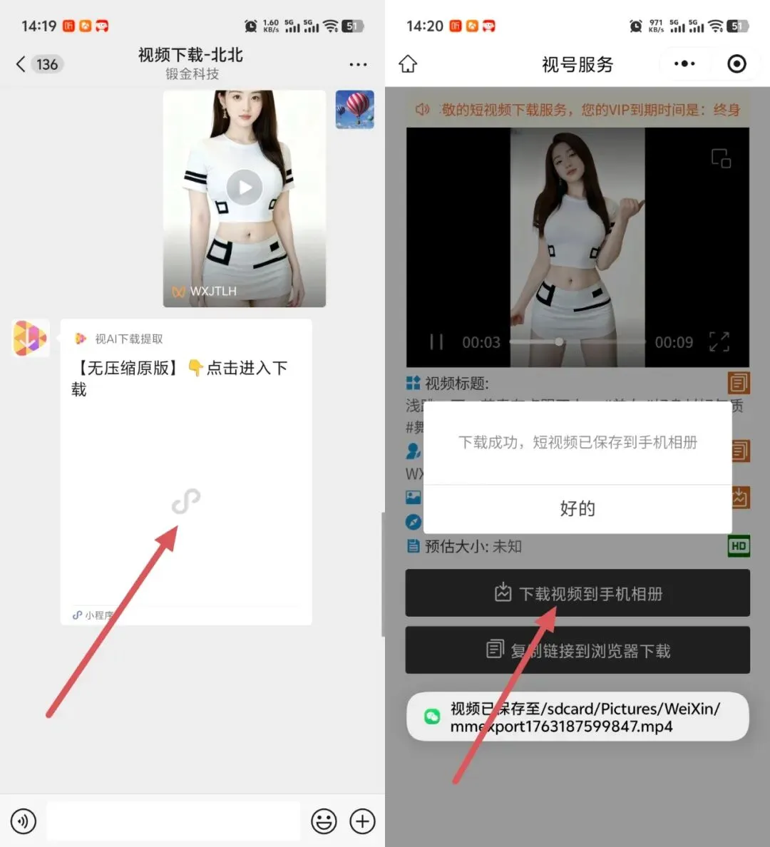 🎁 稍等片刻,「视频下载机器人」会自动解析视频,并返回一个下载小程序链接。进入小程序,即可一键下载到手机相册!🎉
