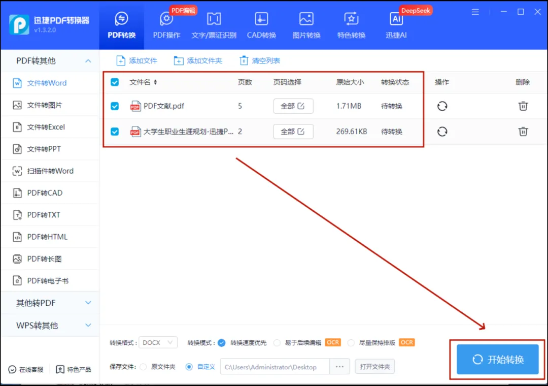 在下方设置【转换格式】(Docx或Doc)和【转换模式】,点击右下角的【开始转换】按钮;