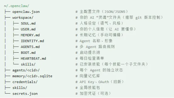 | 配置文件与数据 | ~/.openclaw/ | 主配置目录,存储所有核心数据、记忆、技能和用户设置 |