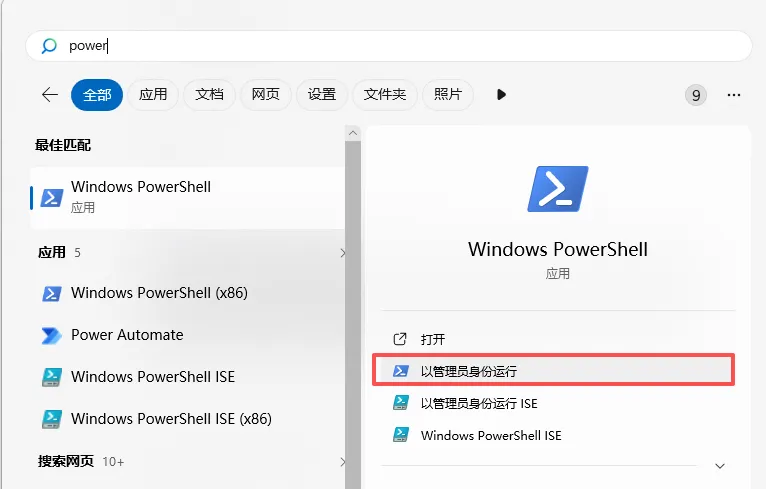 管理员身份运行windows powerShell