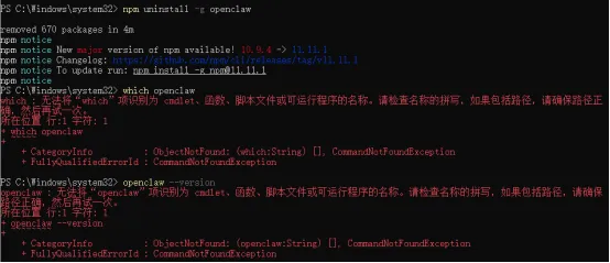 #全局卸载npm uninstall -g openclaw#执行后查看版本openclaw --version#清理缓存npm cache clean --force