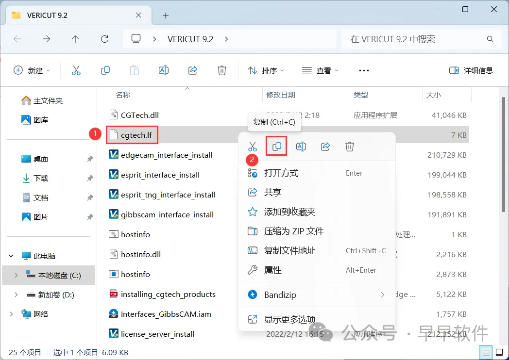 28、回到VERICUT 9.2文件夹,找到【cgtech.lf】文件,再右键点击【复制按钮】