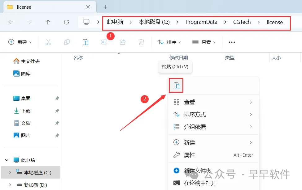 29、打开路径:C:\ProgramData\CGTech\license,再右键文件夹的空白处,点击【粘贴按钮】