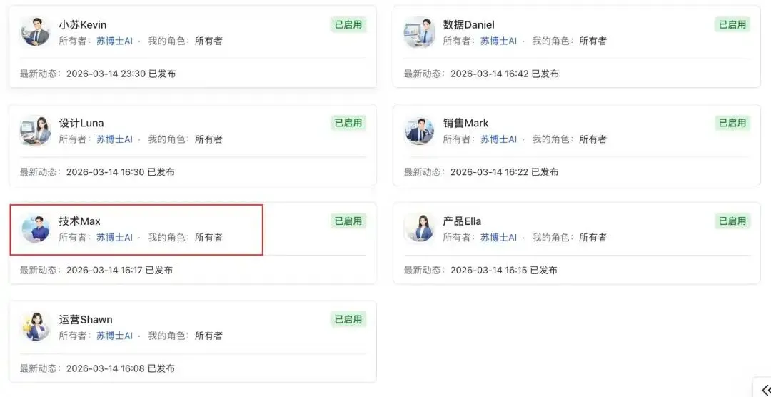 它们全部“已启用”,最新动态集中在 2026 年 3 月 14 日发布,真正实现了角色分工明确、随时待命。